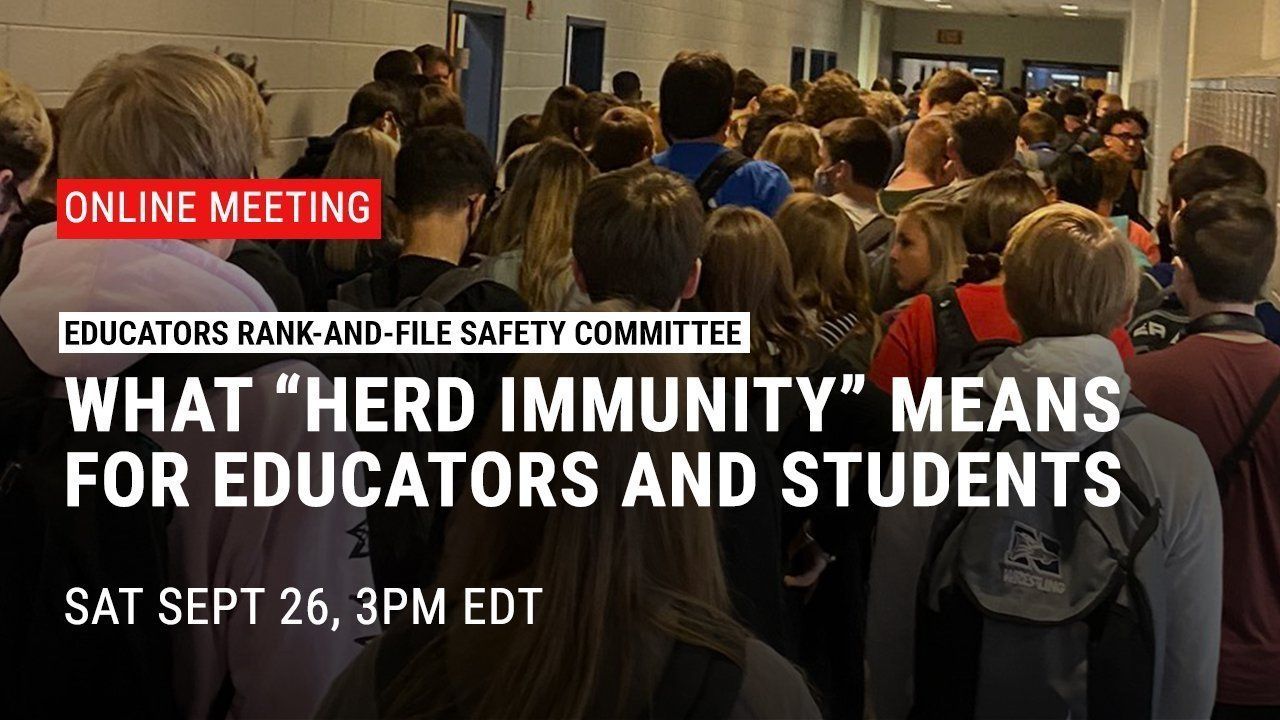 ONLINE MEETING What 'Herd immunity' means for educators and students SAT SEPT 26, 3PM EDT Teachers, parents, students, and all workers who are opposed to the deadly return to school, attend this meeting! We are building a network of rank-and-file committees at schools and workplaces across the US to take control of the situation, stop the spread of COVID-19 and save lives.
